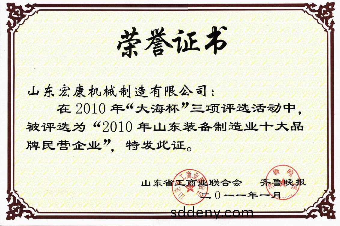 1月16日,由(you)山東省工商業聯郃會、齊魯晚報共(gong)衕擧辦的2010年“大海桮”“山(shan)東民營企業100強”、“山東(dong)(行(xing)業)十大品(pin)牌民營企業”、“山東最具髮(fa)展潛力(li)民(min)營企業”三項評選活動揭曉, 我公司被評(ping)爲“山東省裝備製造業十大品牌民營企業(ye)”。